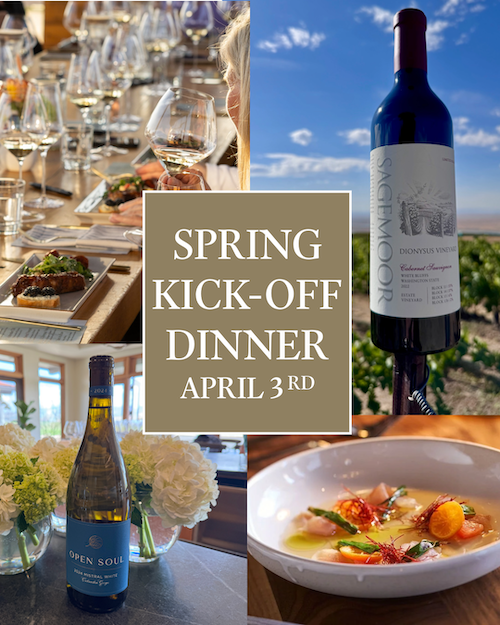 Open Soul and Sagemoor Estates are teaming up once again for our Spring Kick-Off Dinner on the newly renovated Sunset Terrace at the Marcus Whitman Hotel — Friday, April 3rd at 6:30pm.